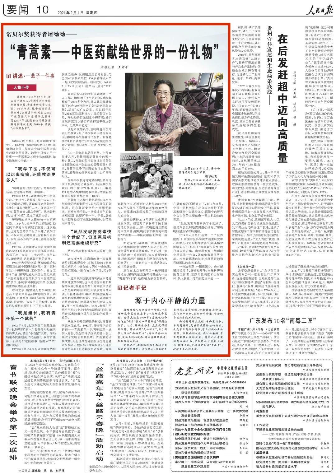 2月4日,《人民日报》刊登了题为《“青蒿素——中医药献给世界的一份礼物”》的新闻,讲述海曙人屠呦呦毕生只致力于一件事——青蒿素及其衍生物的研发,点赞其淡泊名利、追求真理、孜孜不倦的科研精神。