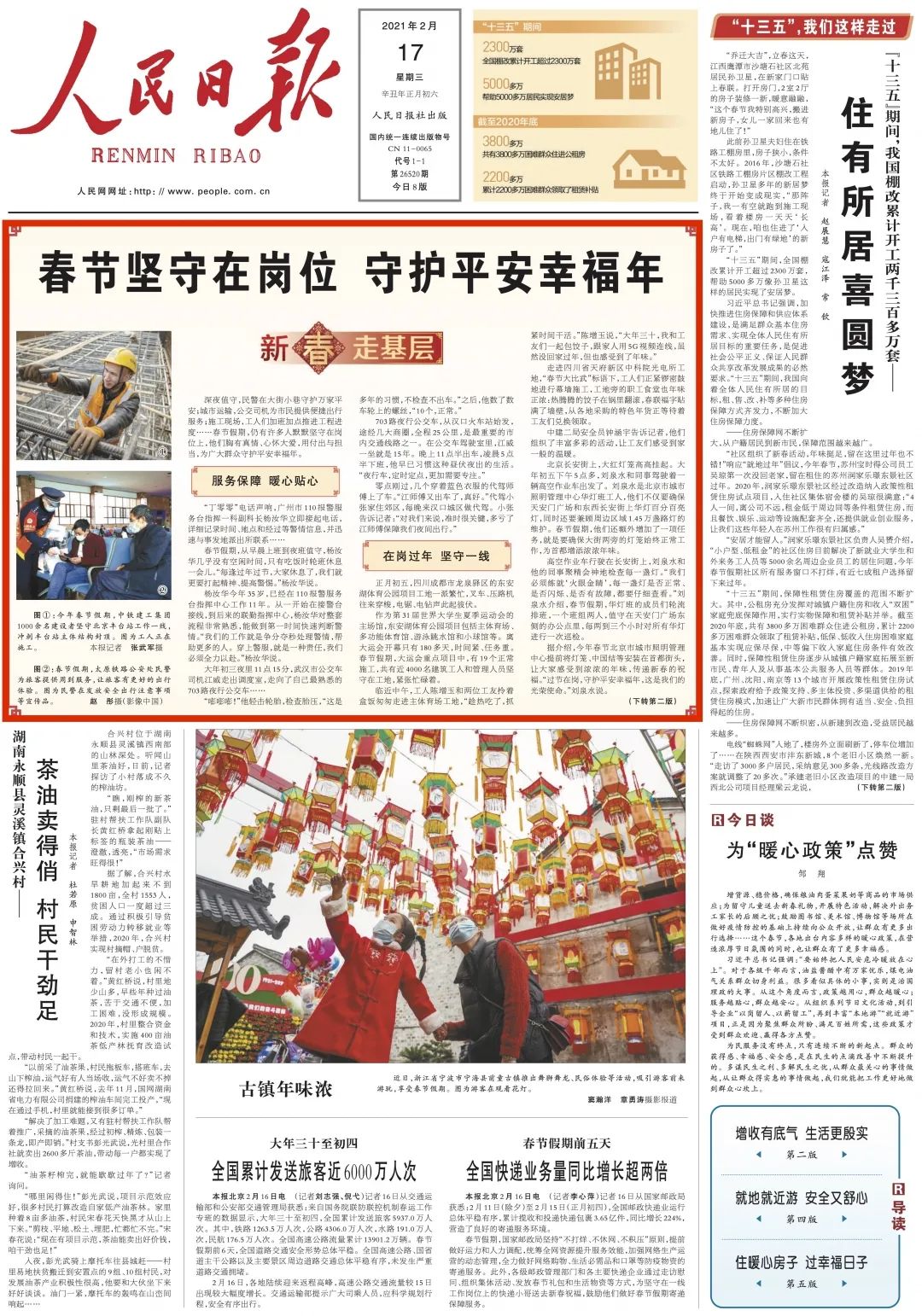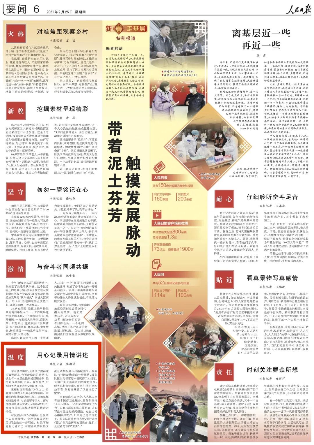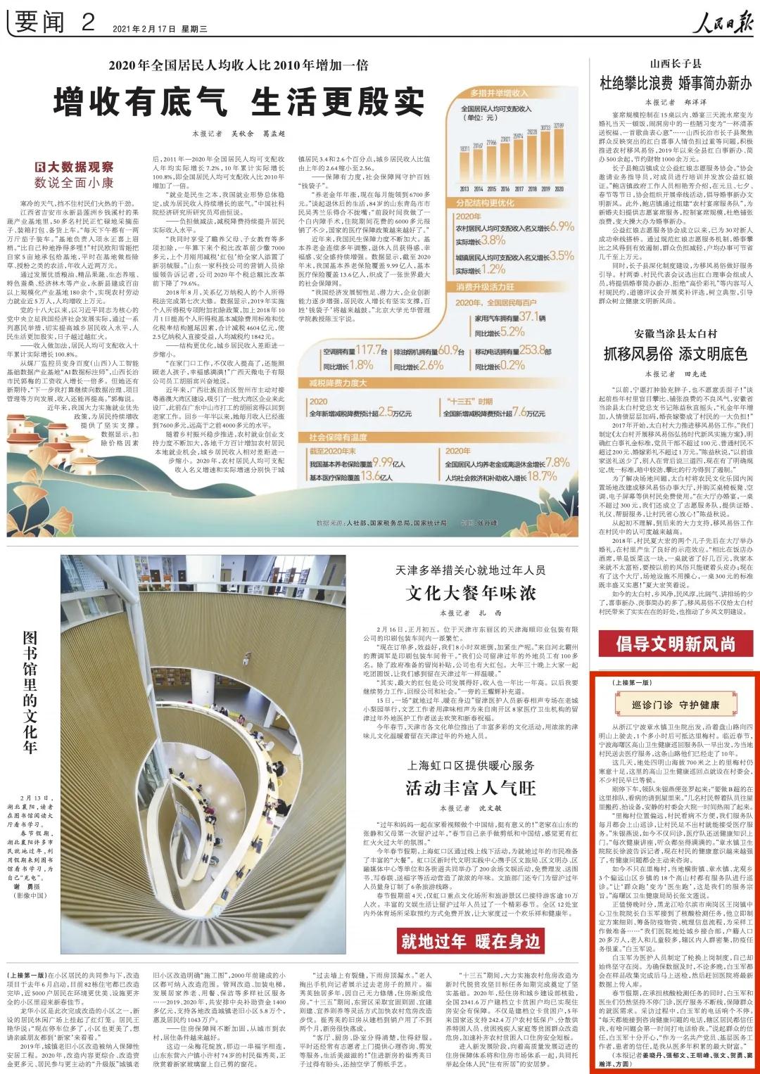 2月17日,《人民日报》头版头条刊登题为《春节坚守在岗位 守护平安幸福年》的新闻;2月25日,《人民日报》刊登题为《用心记录用情讲述》的新闻,综合报道海曙高山卫生健康巡回医疗服务队的暖心事迹。