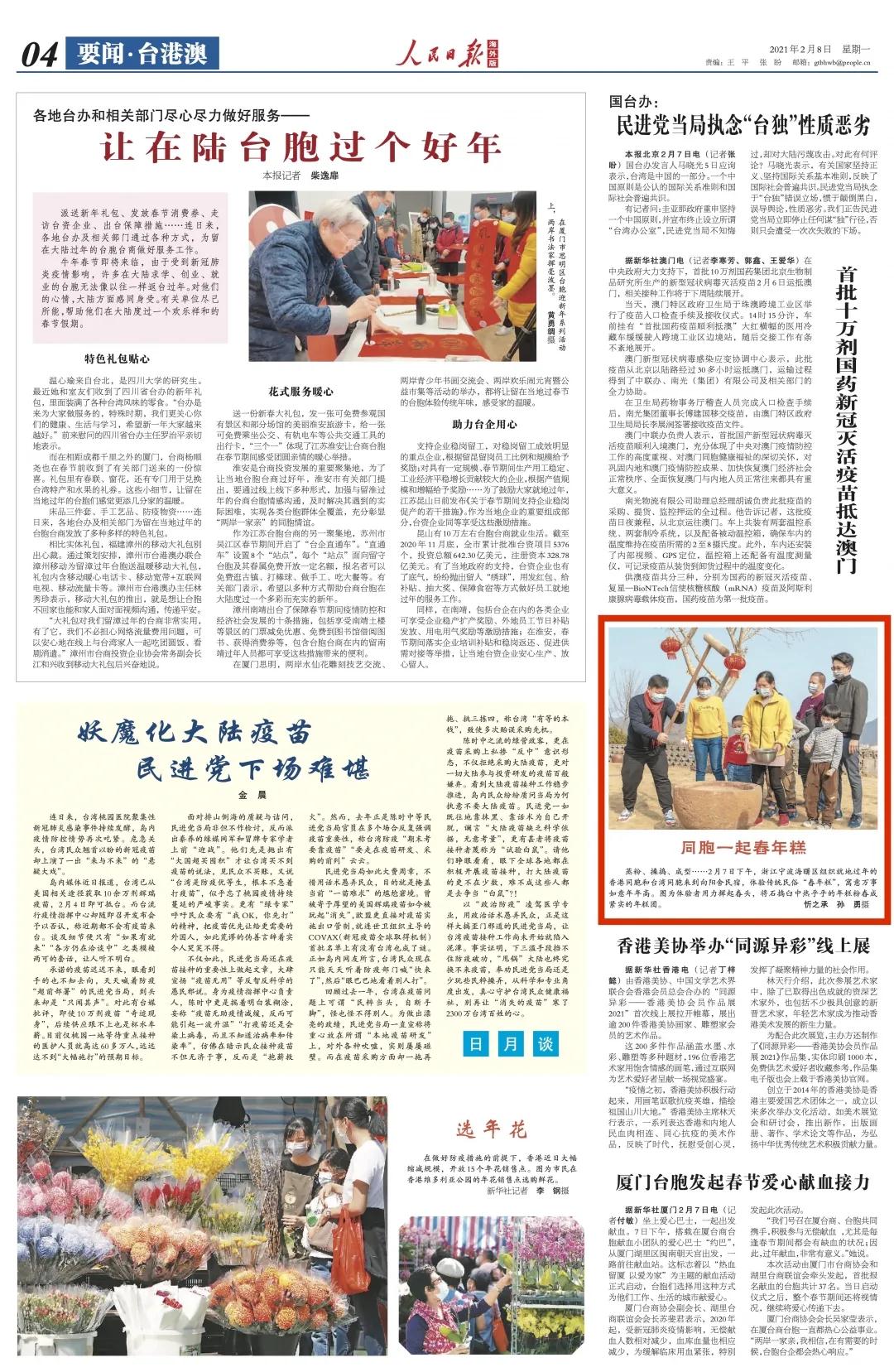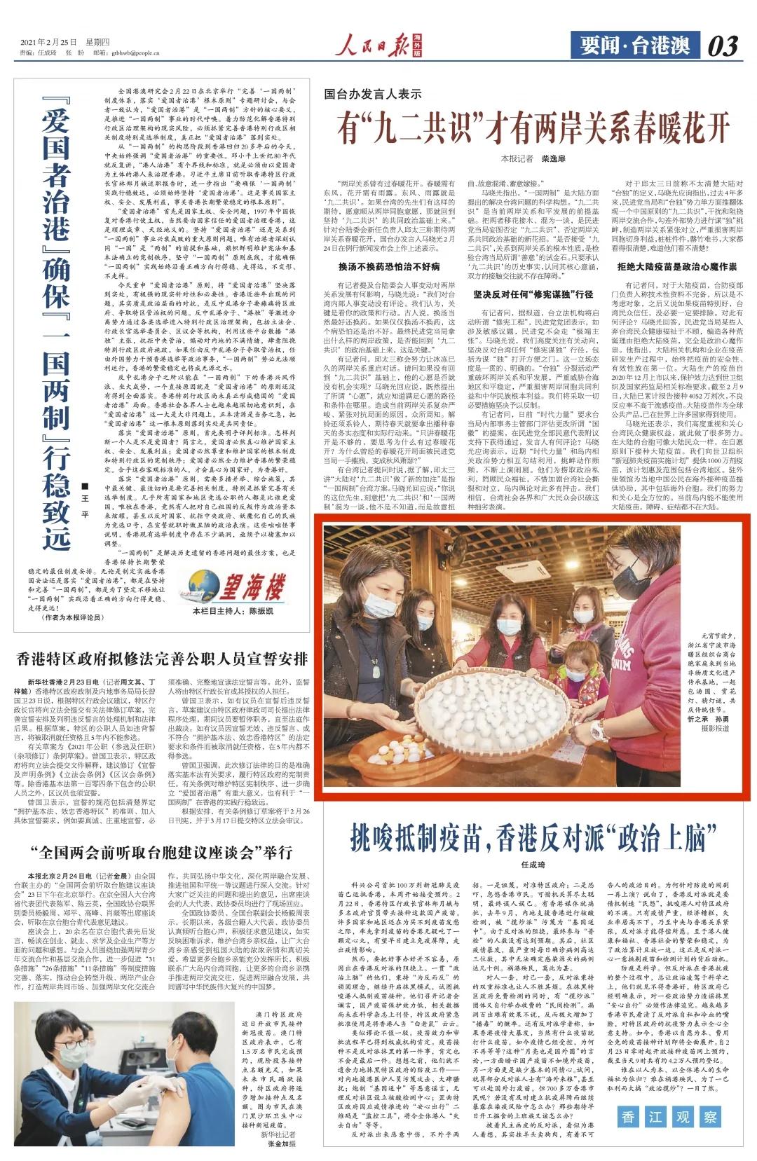 2月25日,《人民日报海外版》刊登图片新闻,关注海曙台商台胞家庭共庆传统佳节。