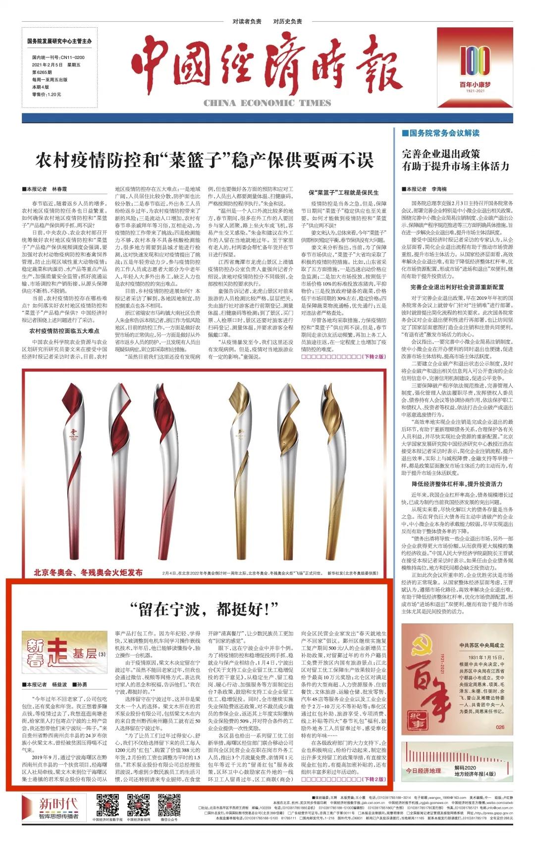 2月5日,《中国经济时报》头版刊登了题为《“留在宁波,都挺好!”》的新闻,关注海曙社会各界留甬过年的好做法。