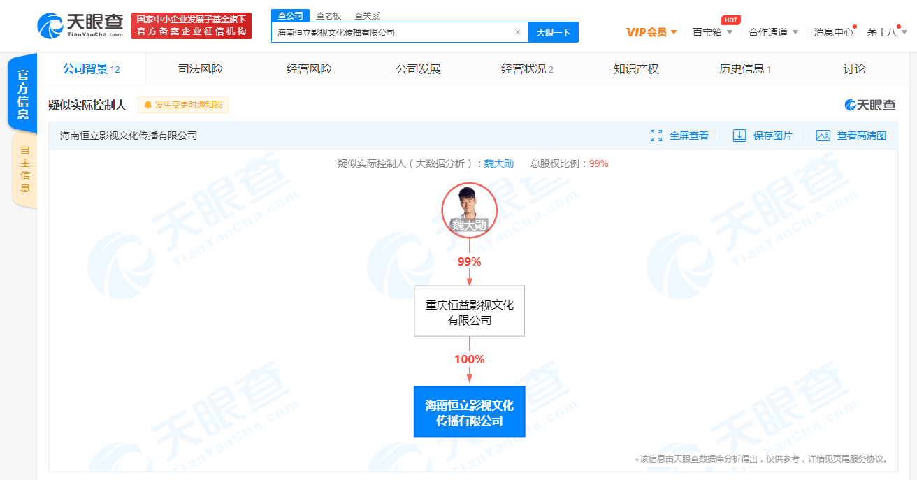 海南恒立影视文化传播有限公司成立于2020年4月,经营范围包括广告制作;文艺创作;电影摄制服务;文化娱乐经纪人服务;房地产经纪;房地产咨询等。股权穿透图显示,该公司由重庆恒益影视文化有限公司100%持股,疑似实际控制人为魏大勋。