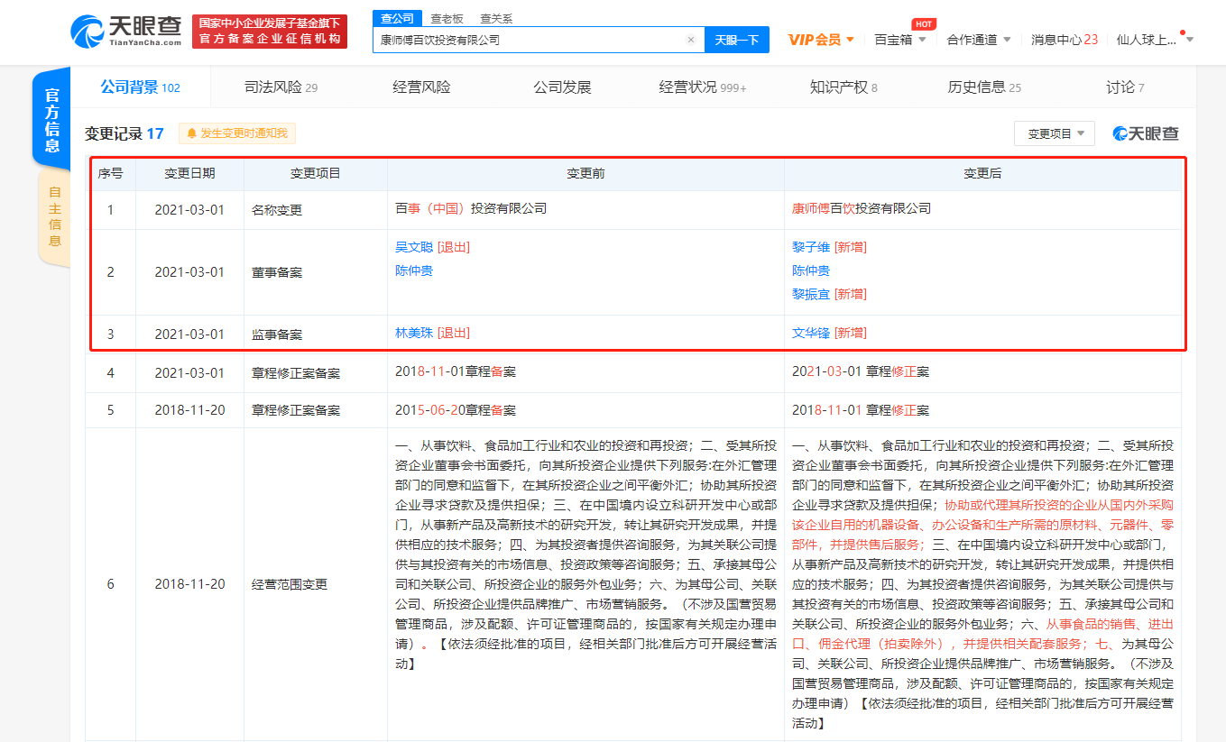天眼查APP显示,3月1日,原百事(中国)投资有限公司发生工商变更,公司名称变更为康师傅百饮投资有限公司。