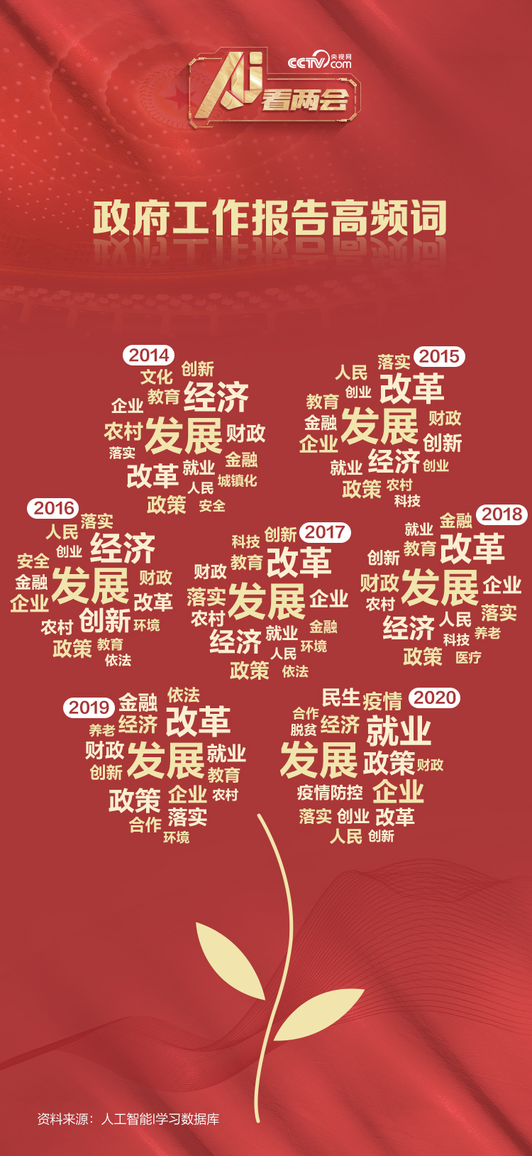 依托人工智能I学习数据库,央视网人工智能编辑部还分析了2014年以来每一份政府工作报告的高频词。