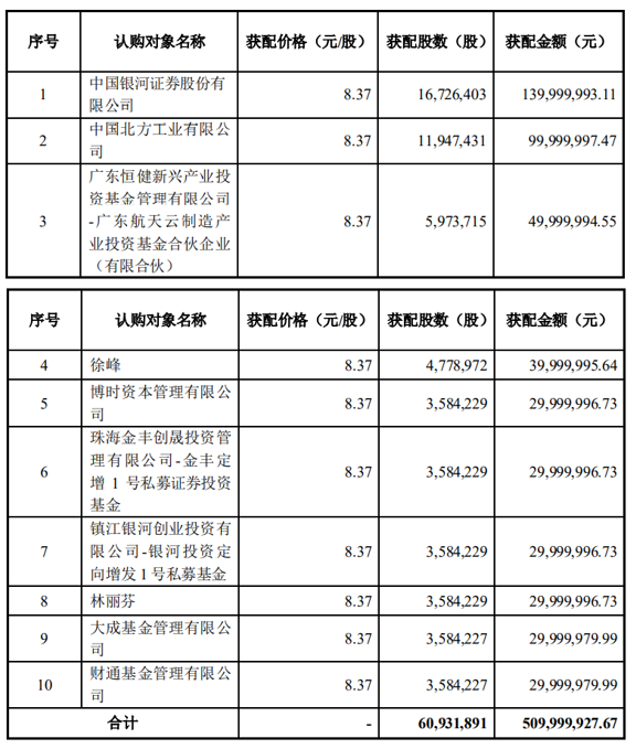 中海达披露向特定对象发行股票并在创业板上市之上市公告书,确定此次发行价格为8.37元/股,发行数量为6093.1891万股,募集资金总额约5.1亿元。此次发行对象最终确定为10家,此次发行配售结果如下: