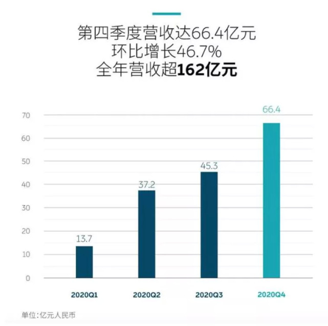 得益于汽车销量的大幅增长,蔚来2020年汽车销售收入同比增长107%,达151.82亿元。2020年全年总收入则为162.57亿元,同比增长107%。