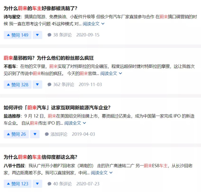 值得注意的是,对于蔚来车主这一群体的争议从未间断,以至于在知乎上有提问“为什么蔚来的车主好像都被洗脑了”。