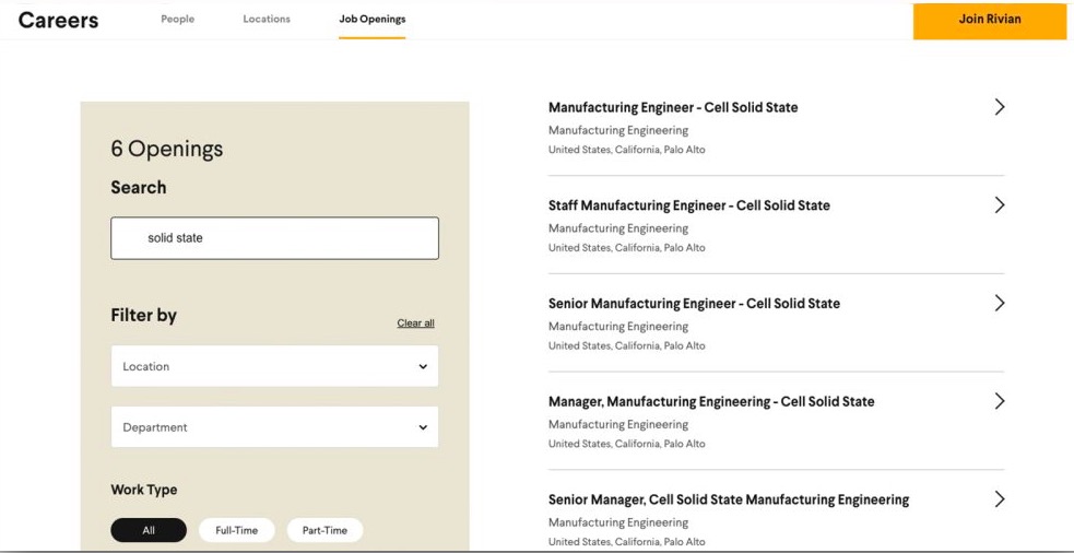 目前列出的五个职位都是为Rivian位于加州的Palo Alto工厂而设。这些职位包括经理和高级经理、高级制造工程师和员工制造工程师,都是固态电池相关岗位。