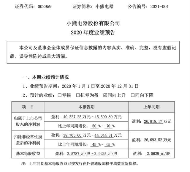 近日,小熊电器发布了其2020年度业绩预告,预计公司2020年的归母净利润为4.02亿元-4.56亿元,较上年同比增长50%-70%;预计扣非净利润为3.87亿元-4.40亿元,较上年同比增长45%-65%。