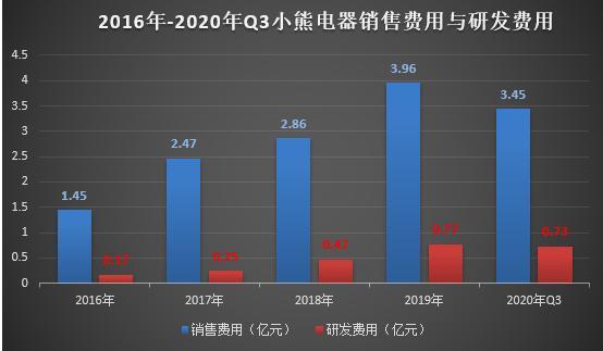 《每日财报》注意到,小熊电器为其品牌宣传做出大规模投入,2016年-2020年Q3,小熊电器的销售投入为1.45亿元、2.47亿元、2.86亿元、3.96亿元、3.45亿元,占总营收比例分别为13.76%、14.99%、14.01%、14.73%、13.8%。