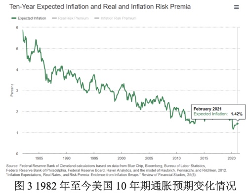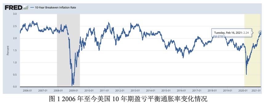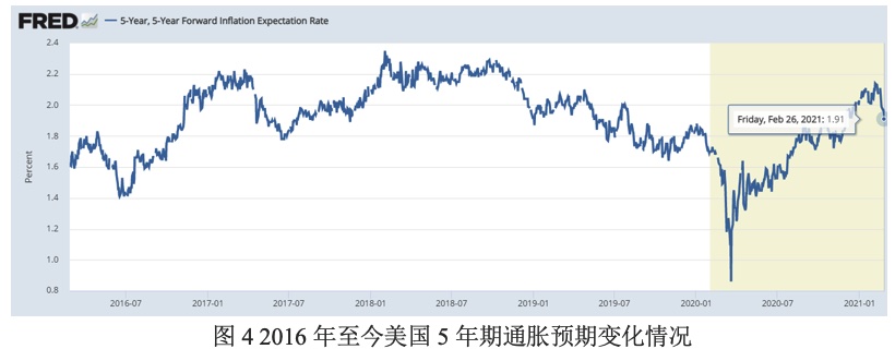 目前市场判断美国通胀预期大幅上升的主要依据是美国10年期盈亏平衡通胀率大幅上升。根据FRED数据显示,2月16日美国10年期盈亏平衡通胀率攀升至2.24%,为近六年半以来最高水平(见图1)。虽然此后有所回落,但2月26日依然高达2.15%。