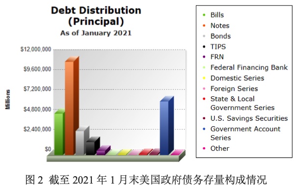 然而,10年期盈亏平衡通胀率不能完全代表通胀预期。10年期盈亏平衡通胀率为名义10年期国债收益率与10年期TIPS收益率之差。而盈亏平衡通胀率除了包含预期通胀率以外,还包含通胀风险补偿。克利夫兰联储的数据显示,2021年2月末美国10年期国债通胀风险补偿为0.42%。如果剔除这一部分,10年期盈亏平衡通胀率蕴含的通胀预期仅为1.73%。另外还有更重要的一点是,美联储在TIPS市场介入程度过深,使得TIPS对通胀预期的信号作用已经大幅失真。美联储的数据显示,截至2021年1月末,美联储持有TIPS的总规模为3156亿美元。而美国财政部的数据显示,截至2021年1月末,美国财政部TIPS余额为1.55万亿美元(见图2)。也就是说,美联储持有TIPS占比高达20%。毫无疑问的是,美联储持续购买TIPS的活动显然很大程度上干扰了TIPS的价格,进而导致10年期盈亏平衡通胀率被大幅高估。