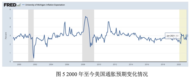 此外,观察其他通胀预期的指标会发现,近期美国通胀预期的确有小幅回升,但总体仍维持相对稳定,并没有出现非常明显的变化。例如,克利夫兰联储的数据显示,2021年2月美国10年期通胀预期为1.42%(见图3)。圣路易斯联储数据显示,2020年3月以来通胀预期持续回升,至2021年2月5日达到峰值2.14%,但2月26日已经降至1.91%(见图4)。美国密歇根大学基于消费者调查的通胀预期显示,虽然近期通胀预期出现小幅回升,但总体波动并不大(见图5)。