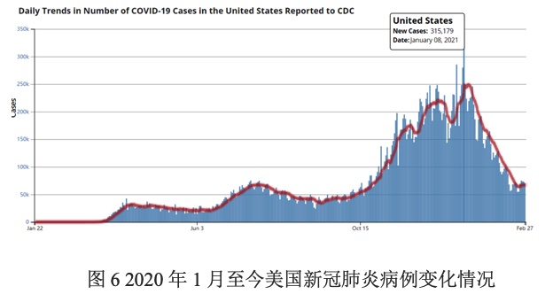 笔者认为,2021年1月份以来美国中长期国债收益率出现明显抬升并非是因为通胀预期上行所致。10年期盈亏平衡通胀率自2020年3月份就开始大幅上升,如果其所代表的通胀预期真的有效,那么10年期国债收益率也早应该开始大幅回升,然而事实并非如此。笔者认为,近期美国中长期国债收益率出现上升主要有两个原因:一是拜登胜选后市场对宽财政预期越来越强烈,拜登巨额刺激方案不断取得进展增强了投资者对美国经济的信心;二是美国疫情数据的边际改善,美国疫情自2021年1月份以来新增病例数持续下降,市场对美国经济复苏的预期有所上升(见图6)。