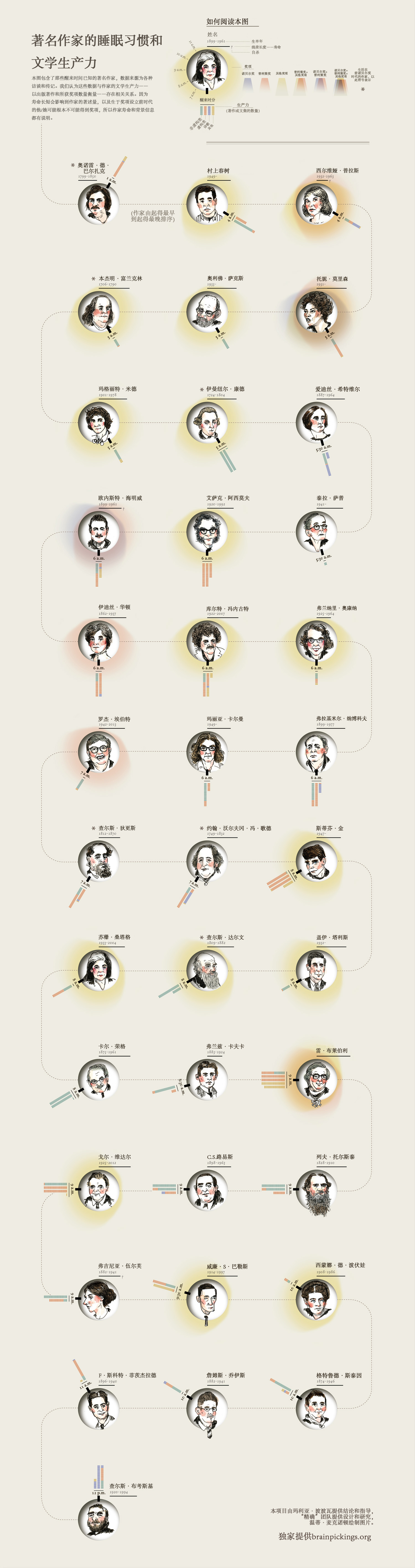 许多年来,在日复一日的日常生活中,我发现自己对那些成功作家的睡眠习惯特别感兴趣——毕竟,有论者认为“睡眠是创意最好(也是最易得)的催情药”,并且科学家已经告诉了我们,从情绪、大脑发育到清醒的每一时刻,睡眠都有着重大的影响。我发现自己对睡眠习惯和文学生产力之间是否存在关联十分好奇。当然,挑战之处在于,每一个变量要么是难以搜寻,要么是很难量化,或者兼而有之。
