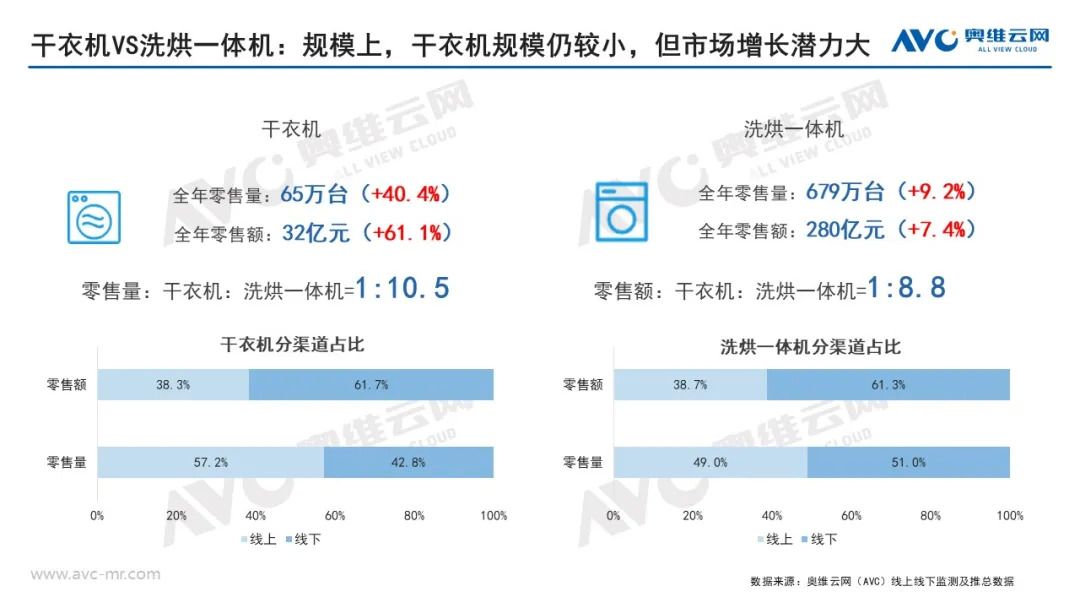 首先,在规模上,干衣机规模仍较小,根据奥维云网(AVC)推总数据显示,2020年干衣机零售量65万台,零售额32亿元,与洗烘一体机市场差距仍然较大,虽然其市场增长潜力大,但短期内难以对洗烘一体机产生威胁。