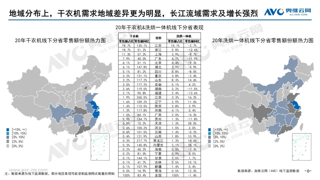 再次,在地域分布上,干衣机需求地域差异更为明显,东南沿海及长江流域需求及增长强烈;而洗烘一体机的地域分布更为广泛与多样,同时,在江苏、广州、浙江等地,干衣机和洗烘一体机的竞争尤为激烈。
