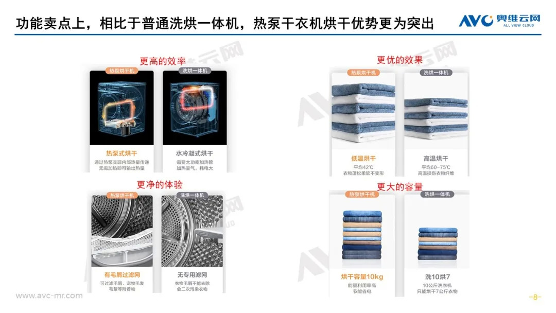 接下来,在功能卖点上,现阶段,线上热泵式干衣机零售额占比已达到74.4%,线下更是高达98.7%,而洗烘一体机多为冷凝式,在功能上,热泵干衣机具有更高的效率、更有的效果、更净的体验和更大的烘干容量。