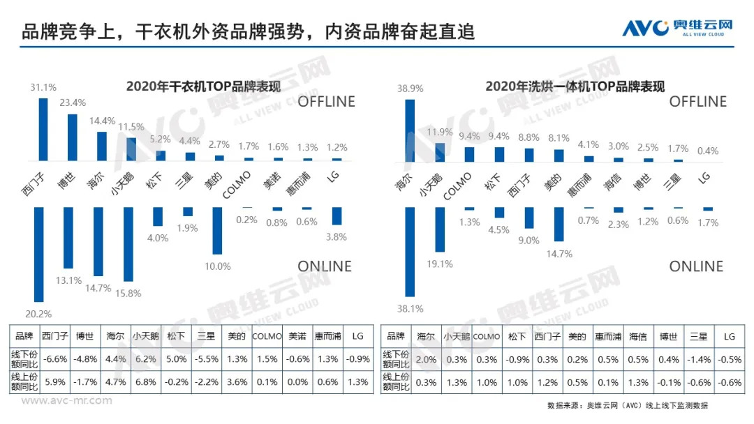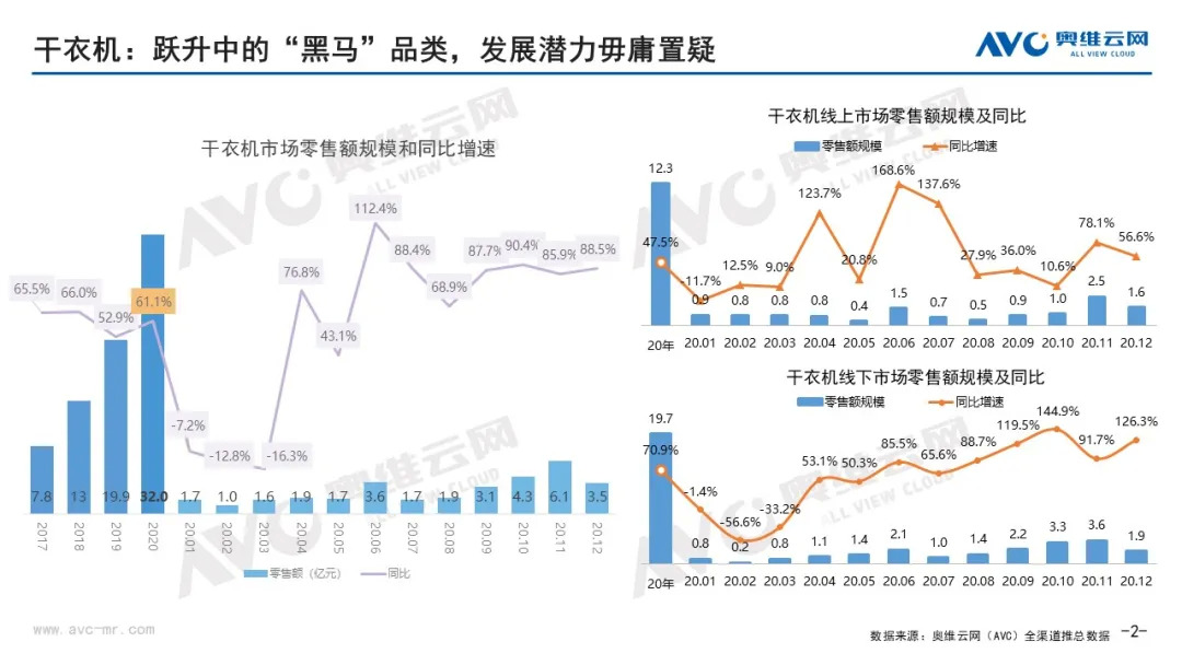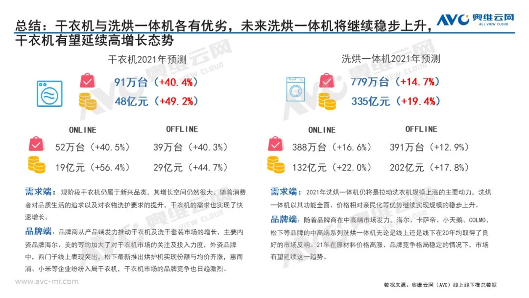 总结来看,短期内干衣机与洗烘一体机并非此消彼长的关系,消费者也会结合自身的使用情况、购买预算、安装空间等进行理性的选择,干衣机VS洗烘一体机仍将是“落霞与孤鹜齐飞”的共同成长局面。根据奥维云网(AVC)预测数据,预计2021年干衣机市场零售量91万台,同比提升40.4%;零售额48亿元,同比上升49.2%;洗烘一体机零售量779万台,同比增长14.7%,零售额335亿元,同比增长19.4%。