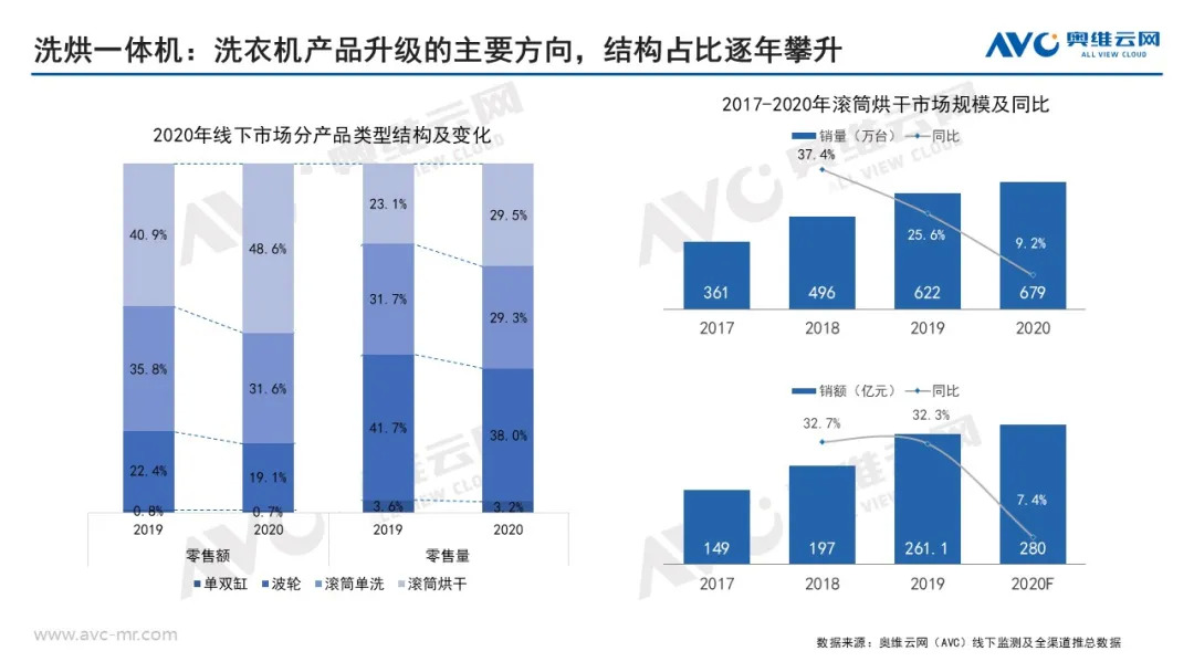 随着干衣机在2020年脱颖而出,一跃为家电中的“黑马”品类,关于干衣机×洗衣机与洗烘一体机的讨论就甚嚣尘上。一方面,干衣机的发展潜力毋庸置疑,另一方面,洗烘一体机亦是洗衣机升级迭代的主要方向,结构占比逐年攀升。那么干衣机的成长是否会对洗烘一体机产生威胁呢?二者是会“此消彼长”还是“共同成长”呢?