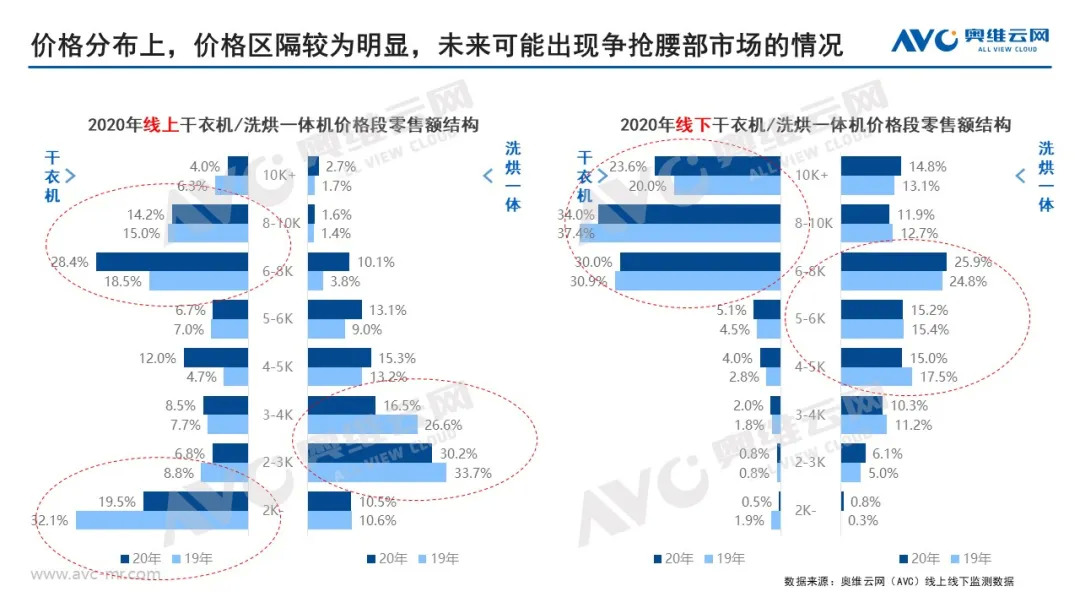 其次,在价格分布上,热泵式干衣机价位段多分布在6K以上,直排式干衣机价位段则在2K以下延展,整体价位段的分布与洗烘一体机区隔较为明显。未来,随着热泵式干衣机占比提升、竞争激烈,价格也会向亲民化发展,腰部市场可能会出现洗烘一体机与干衣机共同争夺的情况。