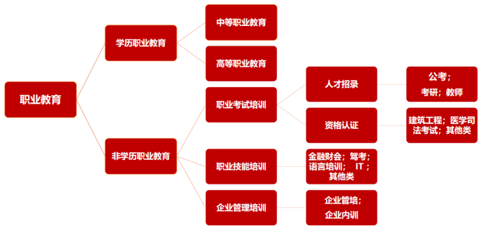 职业教育包括学历和非学历职业教育两大类。公务员培训归属于非学历职业教育下职业考试培训行业,与事业单位、教师类和专业学科应用考试类一同归属于招录/资格考试细分市场。