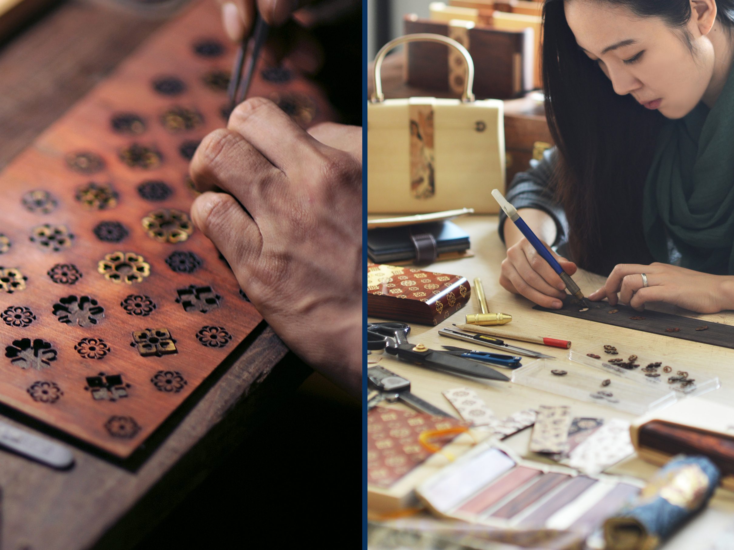 界面时尚从端木良锦处得到了一系列数据:用于作为花纹的木料需要被磨平、切割成厚0.4-0.5毫米;它所要被镶嵌的位置是事先挖好的凹槽,镶嵌缝隙极小,误差需要被控制在0.1毫米之内;一整只满工嵌花木作手包的制作一共会经过22个流程,194道工序。