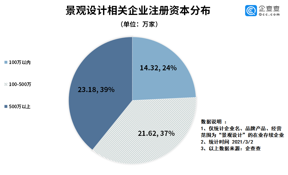 从企业规模来看,企查查数据显示,注册资本在500万以上的景观设计企业所占比例较大,共23.18万家,达到了总量的39%。其次是注册资本在100-500万之间的景观设计企业,占比总量的37%,注册资本在100万以内的企业仅占比24%。