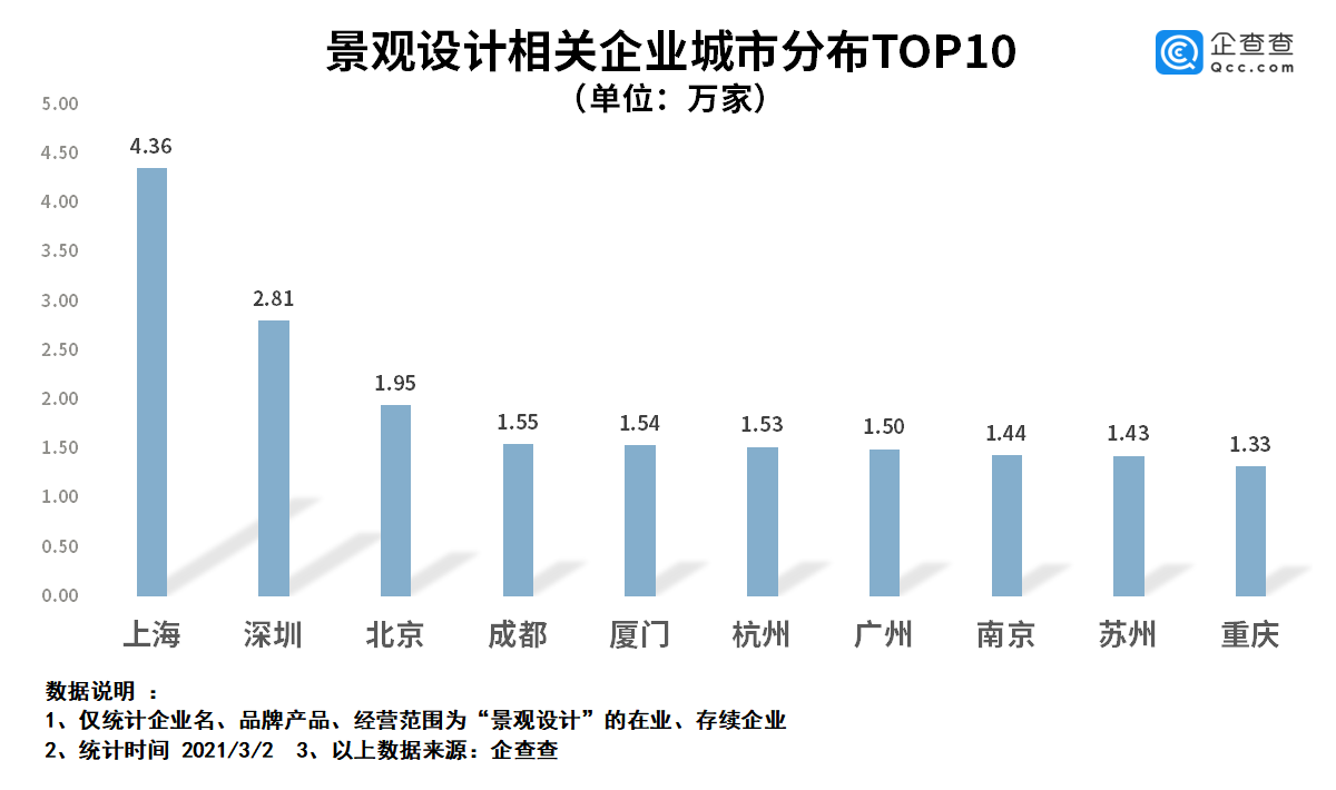 从城市分布来看,企查查数据显示,我国景观设计相关企业主要分布在一线城市和二线城市,目前上海、深圳、北京的企业数量排名全国全三。其中上海市企业数量位居全国第一,目前以4.36万家相关企业遥遥领先。深圳市排名第二,共2.81万家企业。北京市位列第三,有1.95万家企业。此外,入围企业数量前十名的城市还有成都、厦门、杭州、广州等。