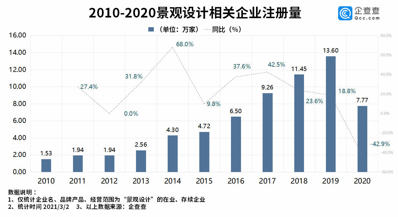 企查查数据显示,最近十年来,景观设计相关企业注册量逐年攀升,2019年达到最高的13.6万,同比增长18.8%。2020年,疫情之下的中小景观设计公司受到冲击,景观设计企业注册量出现大幅下跌,注册量仅为7.77万家,同比下降了42.9%。