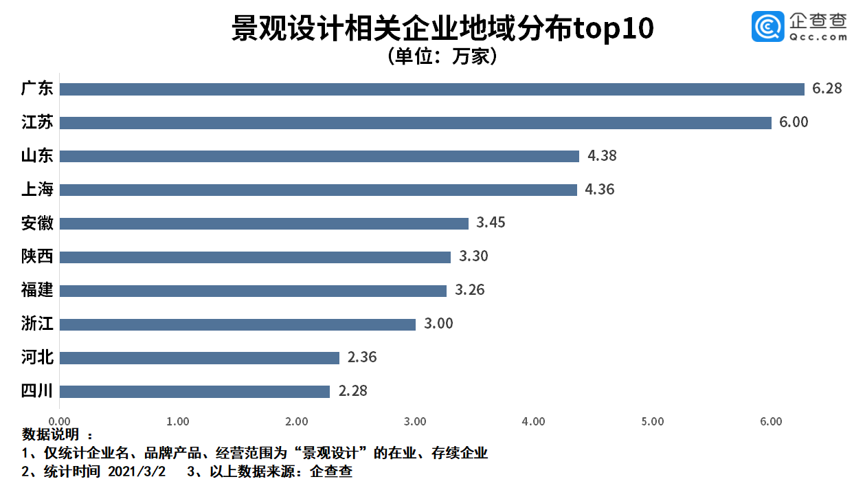 从省份分布来看,景观设计相关企业数量最多的是广东省,一共6.28万家,江苏省和山东省位居第二和第三,分别为6.0万家和4.38万家。此外,入围企业数量前十名的地区还有上海、安徽、陕西、福建等省份。