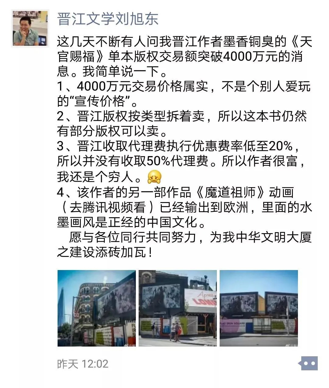 由于开启付费制度比较早,阅文集团旗下的起点中文网吸引了业内大量优秀作者,另一个赢家晋江文学网也因给予作者优待实现了人才捆绑。在《天官赐福》版权出售后,晋江创始人刘旭东就发朋友圈表示作者在版权收入上一直拿大头,称晋江收取代理费执行优惠费率低至20%,所以作者很富但自己还是穷人。