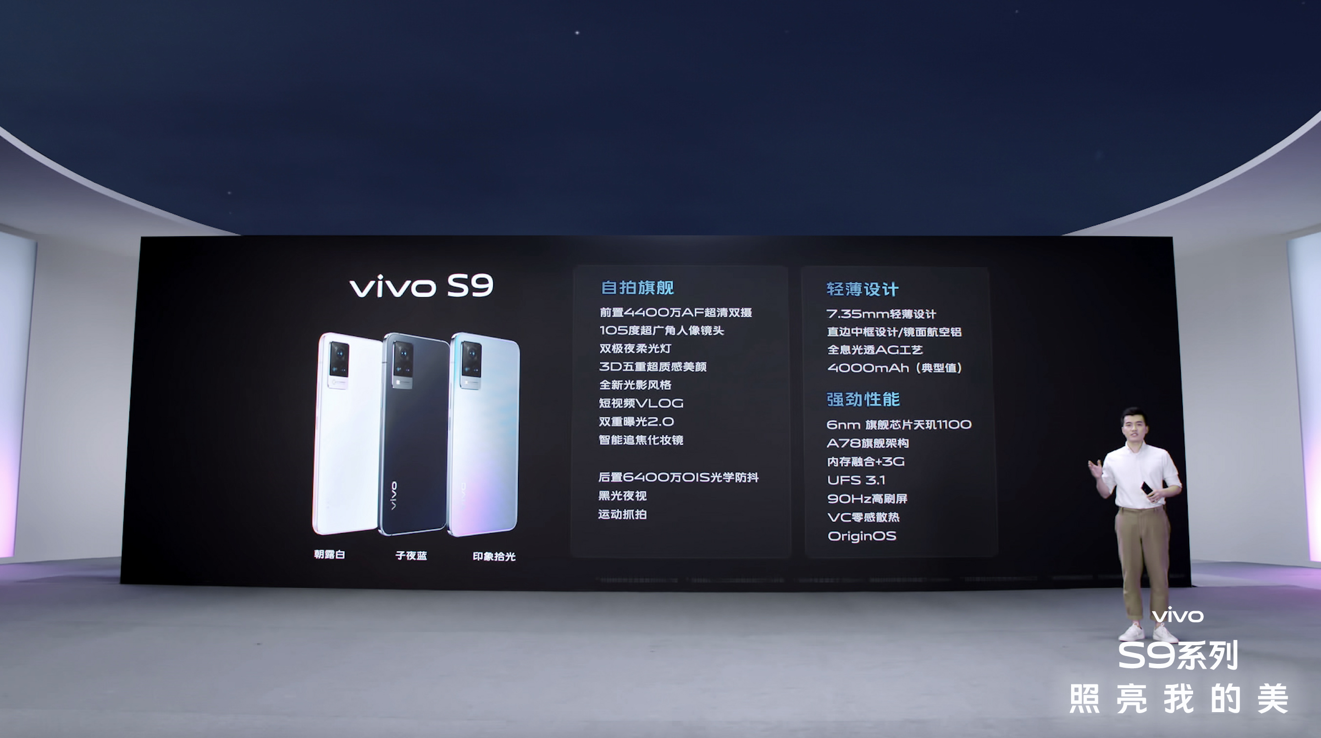 3月3日,vivo发布了新一代自拍旗舰S9,提供印象拾光、子夜蓝、朝露白三款配色,起售价2999元。