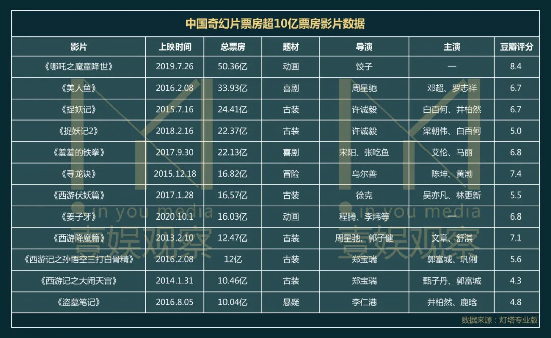 壹娱观察(ID:yiyuguancha)整理了国产奇幻片票房过十亿数据,从图表可得知,根据中国古典神魔妖小说如《西游记》《山海经》《聊斋志异》《封神榜》等改编的古装奇幻片占据最主要位置。其中,《哪吒之魔童降世》过50亿元票房、《捉妖记》系列累计达46亿票房。
