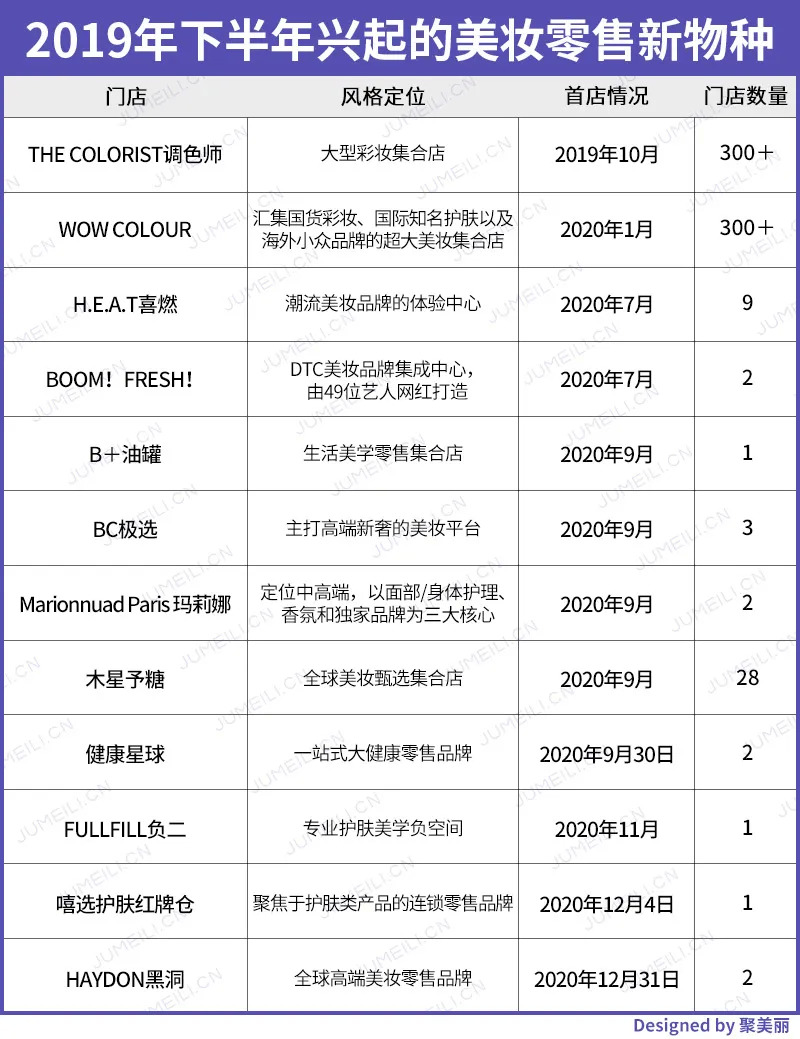 据不完全统计,自2019年下半年就涌现了B+油罐、H.E.A.T喜燃、健康星球、HAYDON黑洞、木星予糖、嘻选护肤红牌仓等数十个新锐集合店,这其中木星予糖开店仅3个月就强势扩张至28家,THE COLORIST调色师和WOW COLOUR在一年多的时间也都开出了300+的门店。