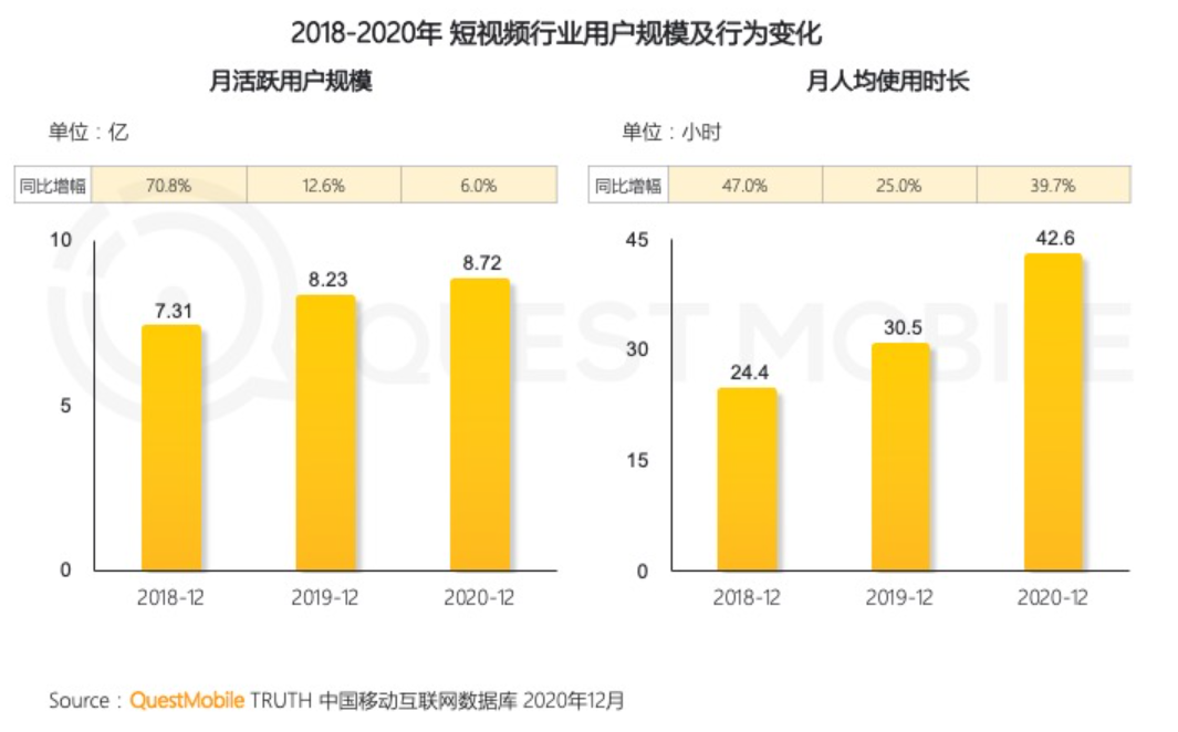 根据Quest Mobile调查数据显示,2020上半年期间,短视频占据用户的时长份额已接近20%,成为了仅次于即时通讯的第二大行业。截至2020年12月,短视频用户规模仍不断扩大,尤其是人们对于短视频的人均使用时长增长仍然明显。