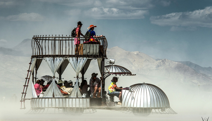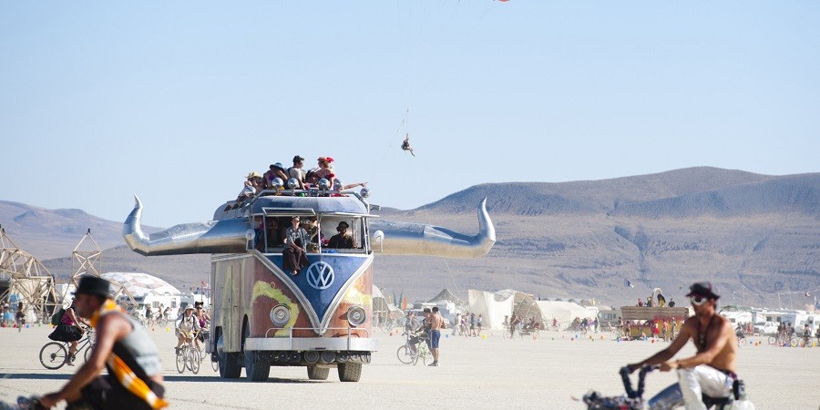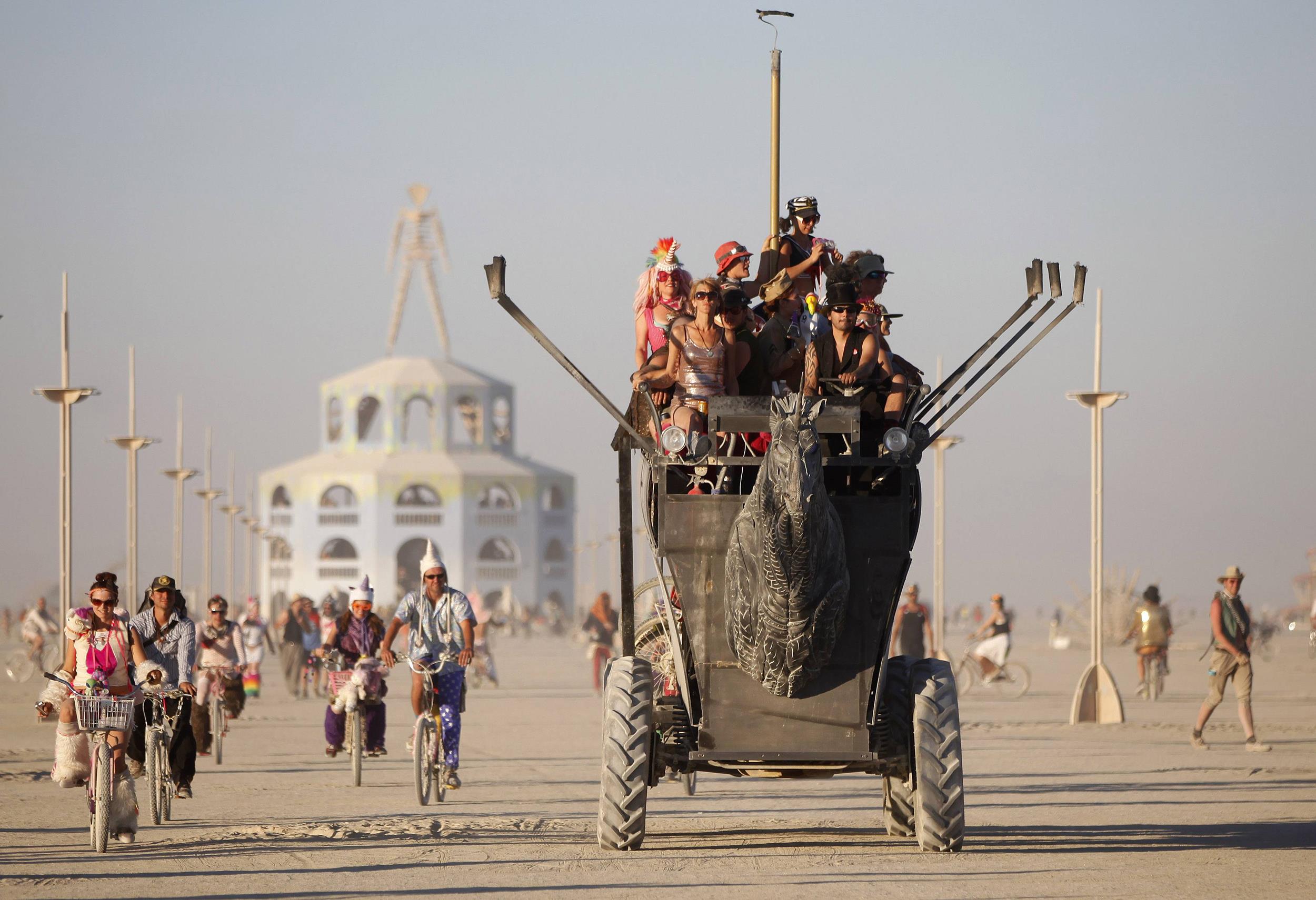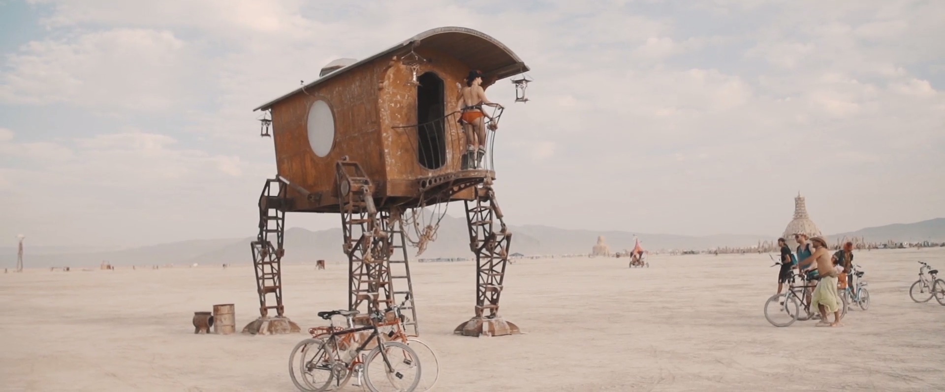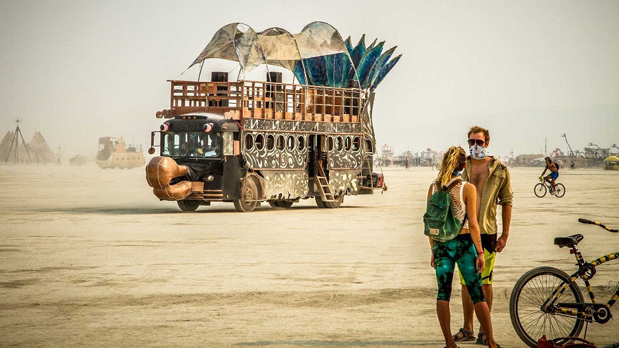 每年,成千上万的参与者都会聚集在美国内华达州的黑石沙漠(Black Rock Desert),来打造一座叫做黑石城的城市,一个充斥着艺术、激进的自我表达、以及彻底自力更生的社区,以各种异想天开与荒诞的形式来“表现自己”。在九天后,所有人就会离开,带走沙漠里的所有物品和垃圾,不留下任何痕迹,让这座城市彻底消失。而之所以会叫做Burning Man,就是因为周六晚上会有焚烧巨大人形木肖像的仪式。
