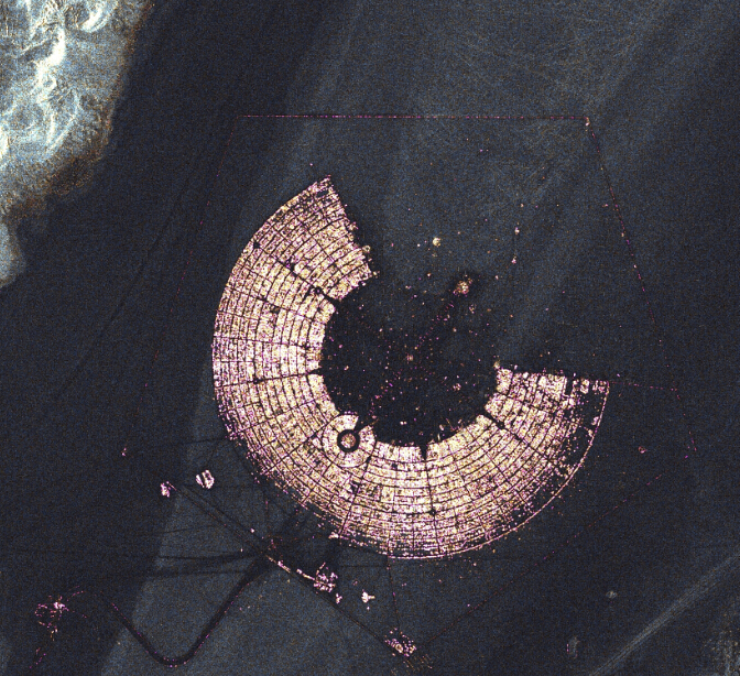 从卫星上看是这样的,圆环的宽度大约是1公里,整个直径大约是3.5公里,像极了麦田怪圈