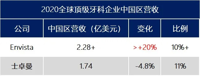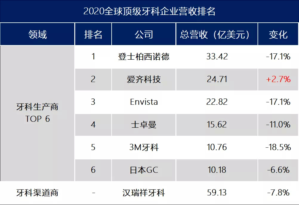 爱齐科技为2020年唯一逆势增长的牙科企业(+2.7%),营收首次超越Envista占据第二;