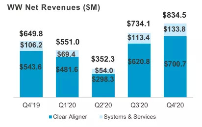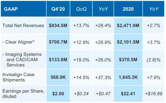 隐形正畸业务的正增长离不开数字化产品Invisalign隐形矫正器的火爆销量,2020年Invisalign再创销量纪录,达到了160万例和7.9%的增幅。