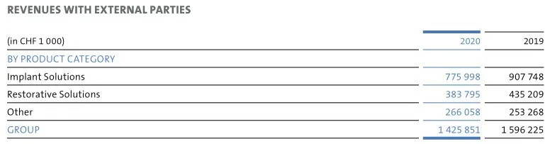 植入物、仪器设备和数字牙科业务的销售下降,以及Covid-19造成的不利生产差异,导致营收下跌,但部分被医疗保健消费业务的增长所抵消。2020年8月,登士柏西诺德宣布减少传统正畸业务。