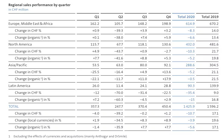 在全球市场中,新冠疫情的全球大流行导致每个区域业绩都难以幸免,欧洲的销售额下滑比例最低,部分归因于美元疲软带来的1.3%的积极影响。登士柏预计,Covid-19疫情仍会对2021年的运营产生负面影响。