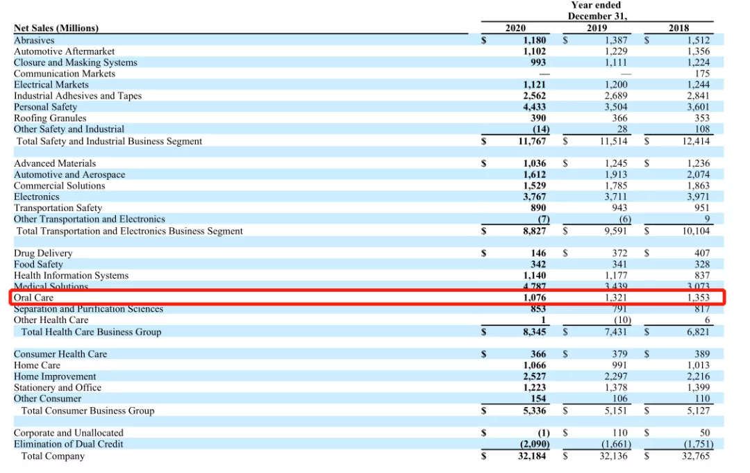 3M公司的口腔护理业务(简称:3M牙科)在2020年的总销售额为10.76亿美元,同比-18.5%,占3M公司总营收(321.84亿美元)的3.34%。