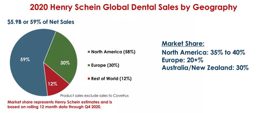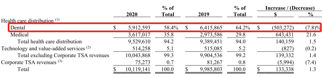 牙科是汉瑞祥占比最大的业务,2020年,牙科业务营收59.13亿美元,同比-7.8%。但另一方面,2019年至2020年,牙科对汉瑞祥的营收贡献从64.2%下滑至了58.4%。