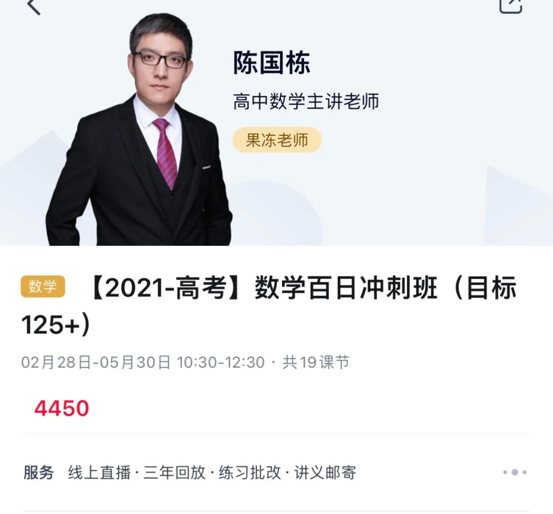 其实智商税研究中心更愿意相信第一种可能,毕竟陈老师现在是高途的明星教师、功勋教师,曾在高途上为无数高中学子讲授课程。目前在高途课堂APP搜索关键词“陈国栋”,显示陈老师还有5个主讲课程,其中有两个是售价为4450元的数学百日冲刺班,目前还在报名状态,且提供“线上直播、三年回放”服务。