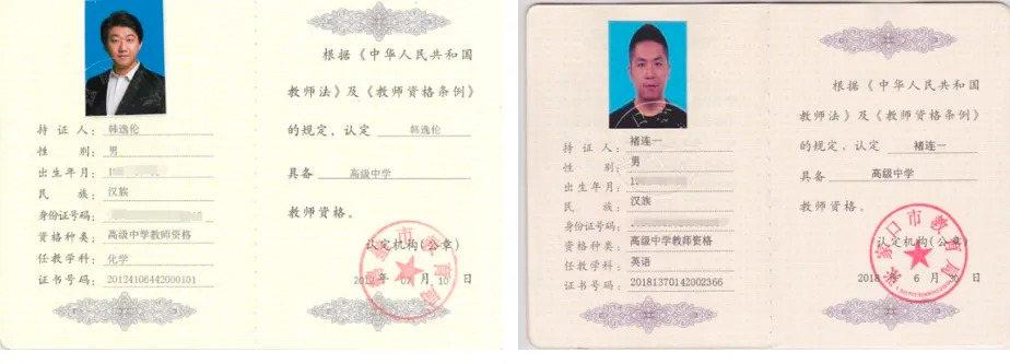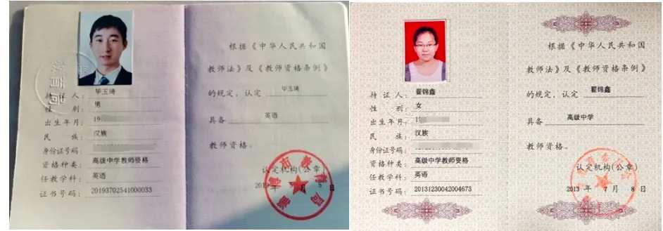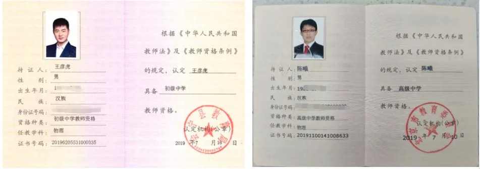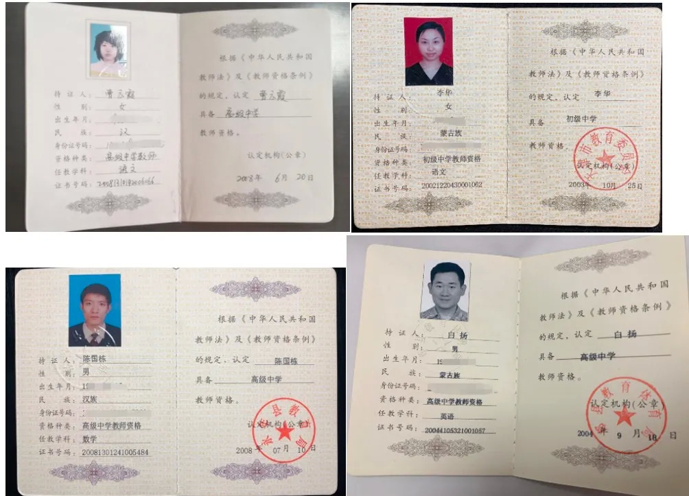 关于教资编号中代表性别的编号与照片不符的情况,经核实,这些老师都有纸质证书,除一些老师的教师资格证获得时间较早,教资网无法查询外,其他老师都已通过中国教师资格网的查验。所涉及老师教师资格证照片如下: