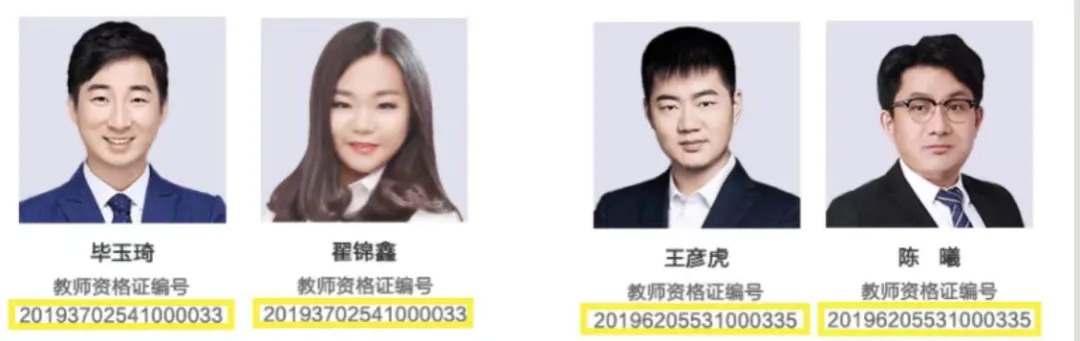 教师资格证认证编码的第10位数字是教师资格类型代码,因为高途是K12教育,也就是说只有取得小学、初中和高中教师资格的老师才可以在高途讲课,但高途有3位老师的资格类型不符,分别为:潘X(编号20113600110320618,1-学前班教师资格,性别也不符)、金X存(编号:20142320051012077,5-中等职业学校教师资格)、张X瑶(编号:20155000172001067,7-高等教育教师资格)。