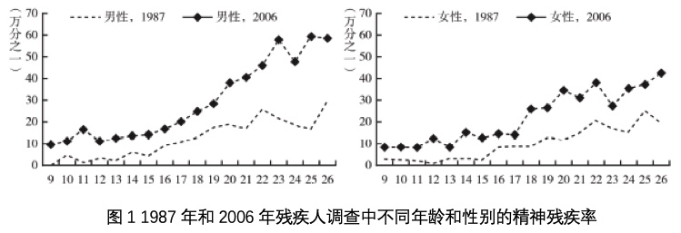 图1 描绘了独生子女政策实施前(1987年)后(2006年)不同年龄和性别的精神残疾率。由图1可见,18—26 岁年龄组的人群相对于 9—17 岁年龄组的人群精神残疾率出现了较大的上升。并且,这种上升幅度对于独生子女政策推行后出生的人群更显著。进一步比较男性和女性,可以得出,这种双重差异对于男性更显著。同时研究还发现,独生子女政策越严格的地区,独立组相对于依赖组的精神残疾率上升幅度越明显。(谭之博,张晓波;2016)