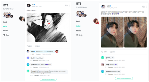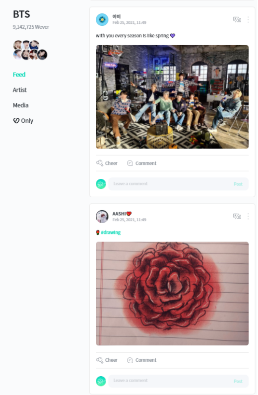 Feed板块是面向艺人全球粉丝的交流空间,在此板块上用户可以自由地以文字和照片形式上传相关内容,通过各种event与全世界粉丝交流。其形式类似于“国际型超话”。