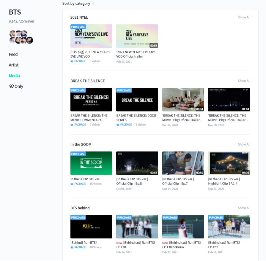 Media部分包含了Weverse独播的艺人视频物料,视频自带多种语言字幕,所选艺人的视频物料以分系列的形式打包在Media板块。