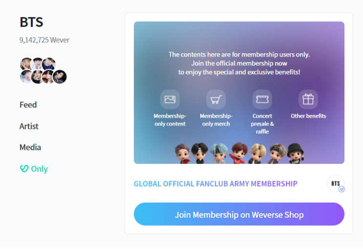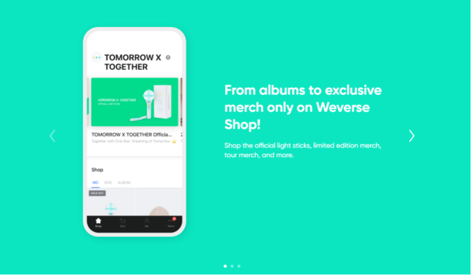 作为Bighit IPO时高估值的一部分,韩国粉丝社区平台Weverse于2019年6月推出,用户可以在此平台上与偶像、粉丝进行交流,并观看偶像独家物料视频。